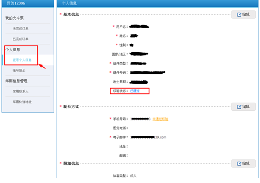 查看个人信息,显示核验状态为:已通过,方可支持网络购票。